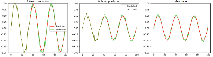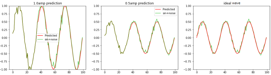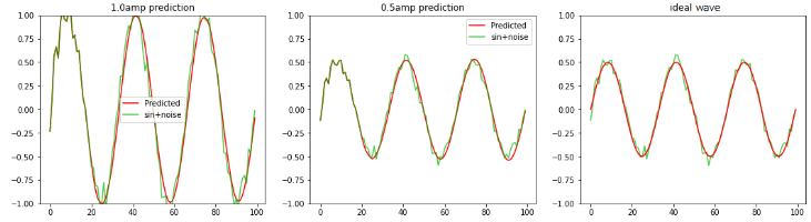 学習時と異なるノイズ波形、振幅を変えたノイズsin波を LSTMへ1.1周期分入力し 2周期〜3周期の波形の平均値、sin波を予測します。 波形が重なった部分が1.1周期分のサンプル値で、それ以降が赤色:予測波形となります。 LSTM個数:36、全波形分割数:100 左図:振幅1.0のノイズsin波形 中央:振幅0.5のノイズsin波形 右図:振幅0.5の理論値sin波形 |