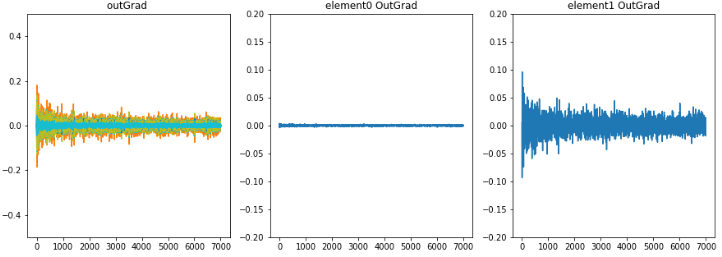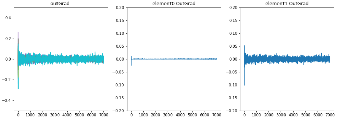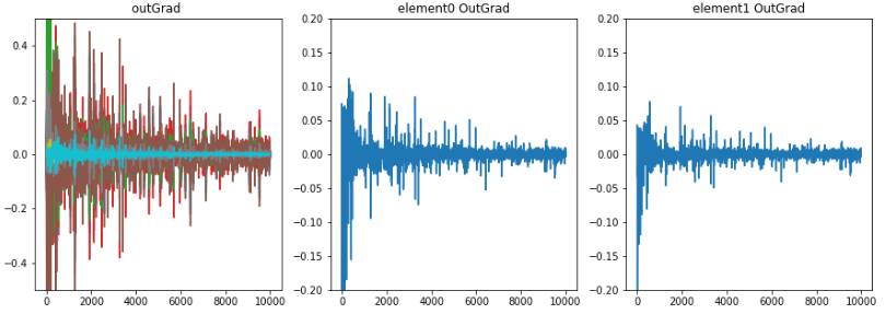 学習時のoutLayerの重みが少し変化したとき誤差の微分値、勾配の推移。