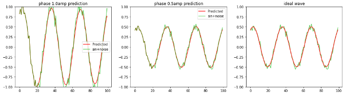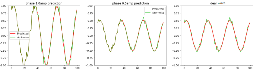 検証として、学習時と異なるノイズ波形、振幅を変えたノイズsin波を LSTMへ0.6周期分入力し 2周期〜3周期の波形の平均値、sin波を予測します。 波形が重なった部分が0.6周期分のサンプル値で、それ以降が赤色:予測波形となります。 LSTM個数:20、全波形分割数:100 左図:振幅1.0のノイズsin波形 中央:振幅0.5のノイズsin波形 右図:振幅0.5の理論値sin波形 |