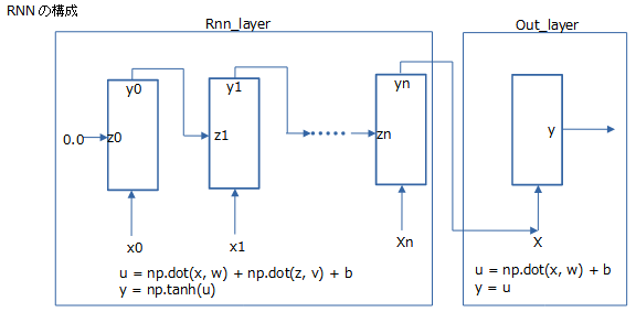 時系列入力データxの重みパラメータw、前時刻のRNN出力Yを入力したZの重みパラメータV