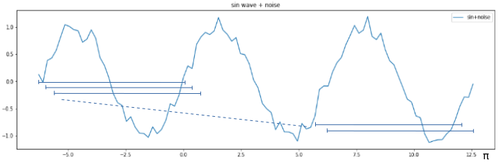 まず、振幅±1.0、長さ6πのsin波に、平均0、標準偏差1の正規分布の乱数を0.1倍したノイズを加算して