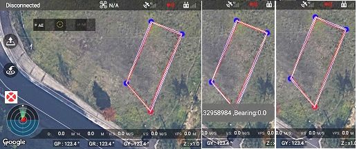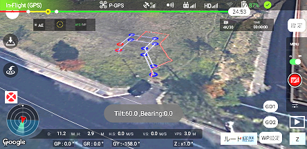 ドローンを毎回同じ位置に置いて、自動飛行を行いました。GPSの誤差が大きいため設定ウェイポイント通りに