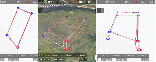 下図は、最終地点が赤丸となっていて、離陸地点と最終地点が同じ場所になっています。 マップ2D上で4点のウェイポイントを設定しその高度を5mにしています。タブレット3D表示に変える ため画面を2本の指で上へ操作します。 ![]()