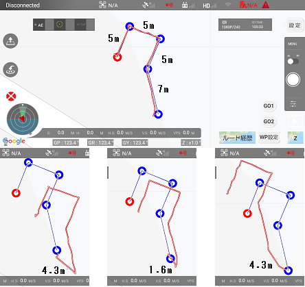 飛行ルート履歴から判断すると約50%の飛行が設定ウェイポイント通りに飛行し、残りの50%が大きくずれています。