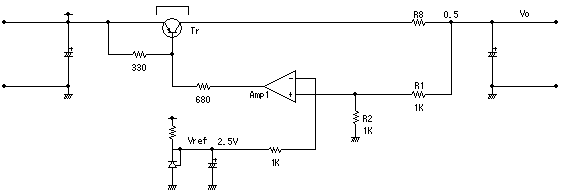 低域でのゲインを40dBとするため、抵抗を100KΩ、 コンデンサを1000pfとすると、OPアンプのロールオフ 周波数は1.6KHzとなります。 下図のような周波数特性となります。 トランジスタの位相が90°遅れる周波数は580KHz程度で、 この時の総ゲインは0dB以下となり、発振は停止します。 (入力電圧6V、出力電圧5V) |