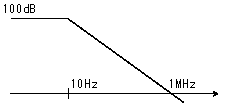 OPアンプの利得帯域幅積Ft は1MHzで、上記回路図では 負帰還がかかっていませんので、10Hzにて位相が45°遅れ 1000Hz以降90°遅れます。 |
