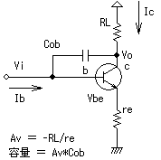 ΔVo = -(hfe+1)*ΔIb*RL Av = ΔVo/ΔVi = -RL/re そして、ベース電流はre及びCobに分流し、Cobの両端電圧は入力電圧Viの Av倍の電圧がかかり、そのため、Cobの電流はAv*Vi/(1/jωCob)となり、 見かけ上のインピーダンスは1/Av倍、見かけ上のコンデンサ容量はAv倍です。 ロールオフ周波数以降、ベース電流がコレクタベース間容量へ分流することにより、 ベース電流が減りアンプのゲインが低下します。 |