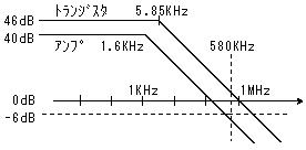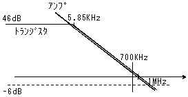 回路図から外部未接続の場合の負荷抵抗は2000Ω、出力5Vとして、約Av=RL/re=200倍、 Cob = 200pf、トランジスタ外部ベース抵抗は、680Ω。 よって、トランジスタアンプのロールオフ周波数は、5.85KHzとなります。 トランジスタのゲインとOPアンプのゲインと分割抵抗の減衰量との総ゲインが0dBとなる周波数を グラフより読み取ると、700KHzとなります。 |