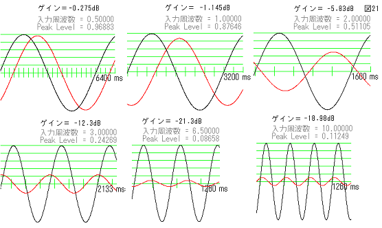 各周波数の正弦波を入力して、出力レベルを計測しています。過度応答がありますので、最低1S以上長い時間、正弦波を入力する事が必要です。
